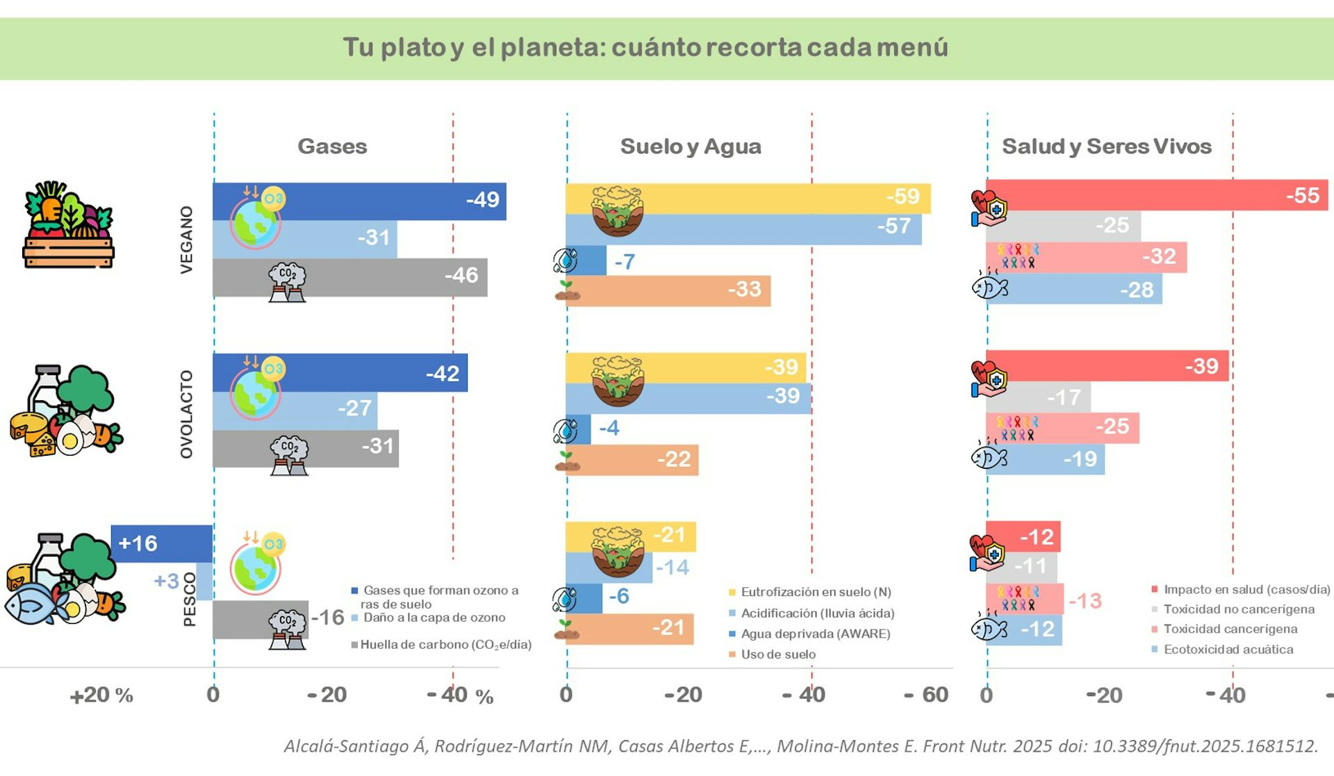 En cuanto a las emisiones, el impacto cae teóricamente a medida que el menú (la dieta) se hace más vegetal: hasta un 46 % menos de CO₂e en el patrón 100 % vegetal frente al omnívoro. Este descenso no solo implica una reducción del efecto en el calentamiento global, ya que una menor emisión de CO₂e suele también implicar menos precursores de ozono y menos partículas secundarias, y una mejora en la calidad del aire.
