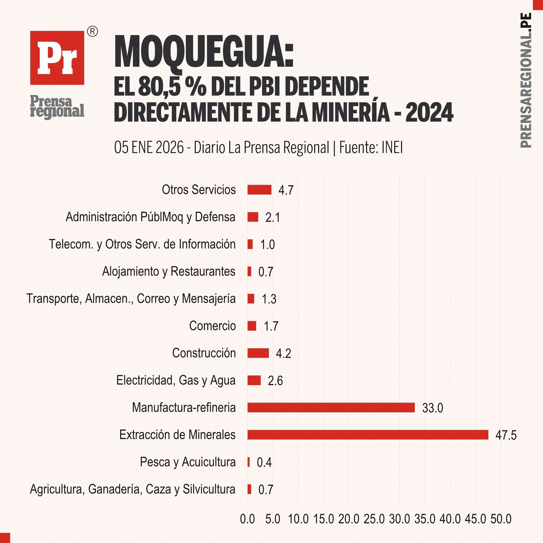 De acuerdo con los datos oficiales, la extracción de minerales representa el 47,5 % del PBI regional, mientras que la manufactura vinculada a la refinería minera aporta un 33,0 % adicional. En conjunto, ambas actividades estrictamente asociadas al complejo minero concentran el 80,5 % del total del PBI de Moquegua, superando ampliamente a todos los demás sectores productivos.