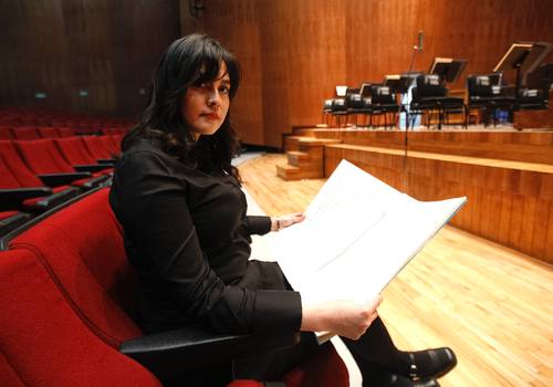 ▲ La veracruzana Estrella Cabildo durante el ensayo de la OFCM, que hoy interpretará su obra.Foto Germán Canseco Ángel Vargas