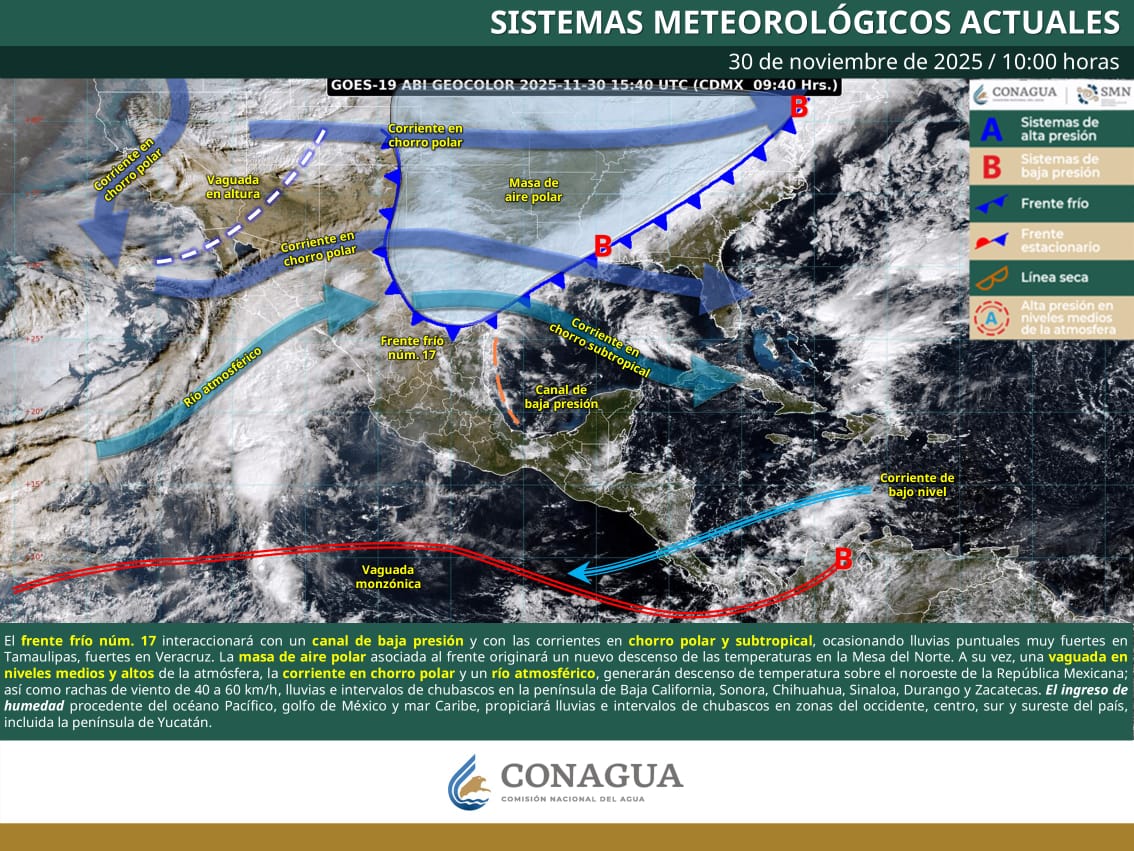 Redacción/Quadratín México CIUDAD DE MÉXICO, 30 de noviembre de 2025.- Para este domingo, el frente frío núm. 17 se