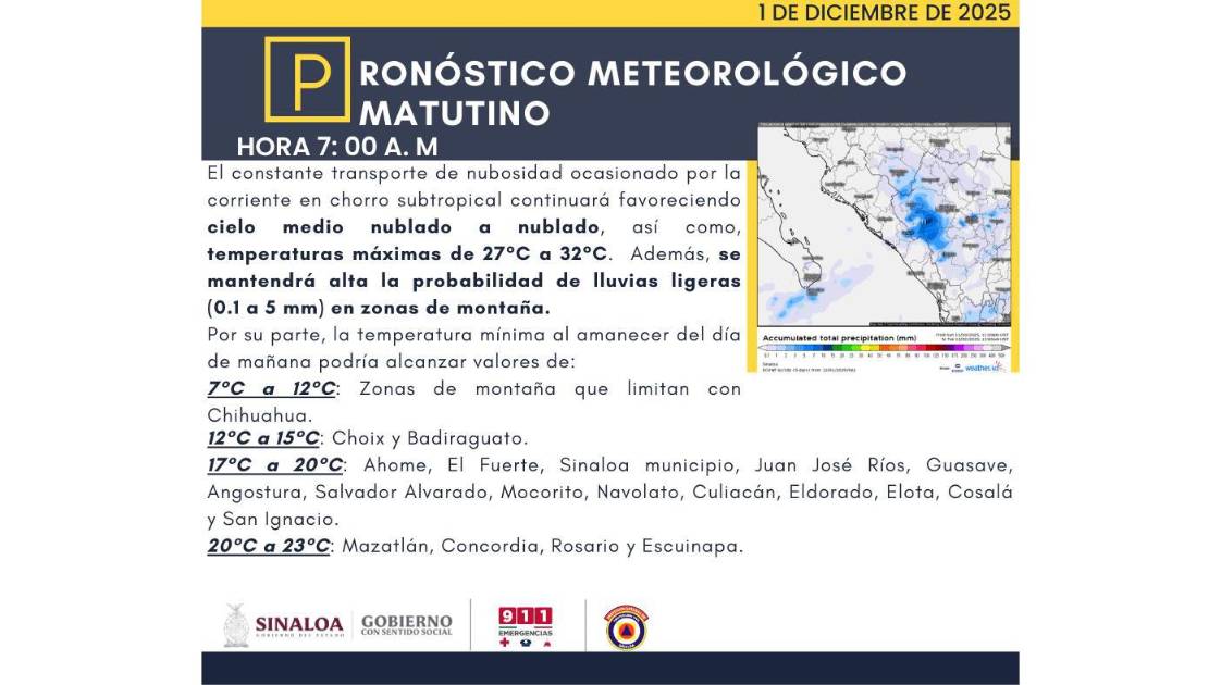 Lluvias aisladas de 0.1 a 5 milímetros o litros cuadrados se pronostican este lunes para Sinaloa, además de rachas de