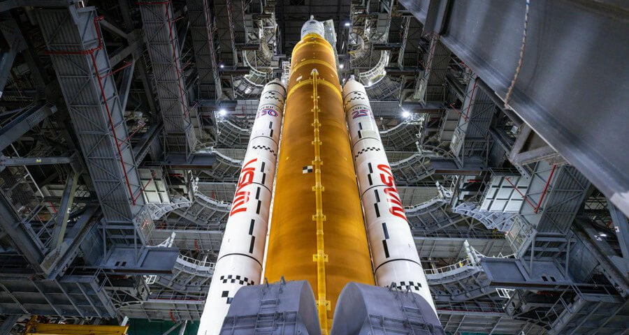 El cohete SLS (Sistema de Lanzamiento Espacial) de la Nasa y la nave espacial Orion de la misión Artemisa II,