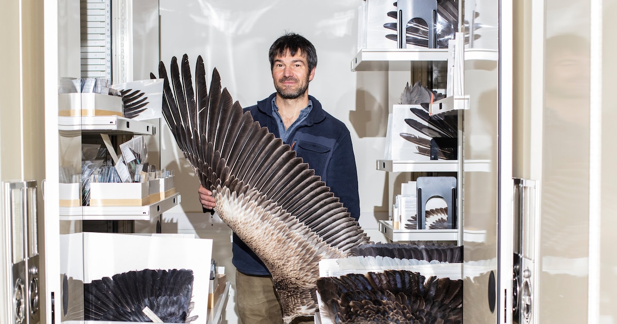 Vanya Gregor Rohwer abrió un cajón para mostrar un ala extendida de color rosa intenso de un ave espátula rosada,